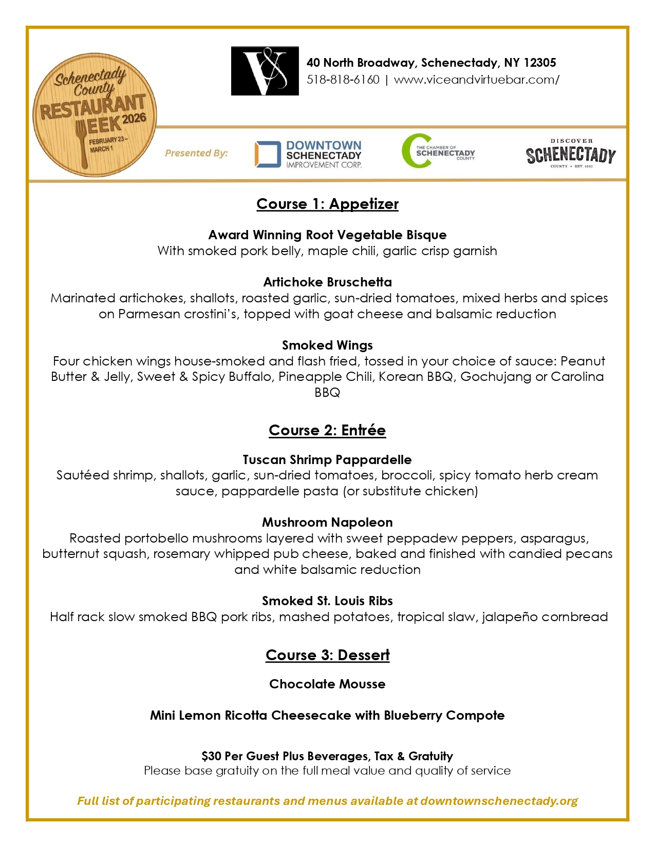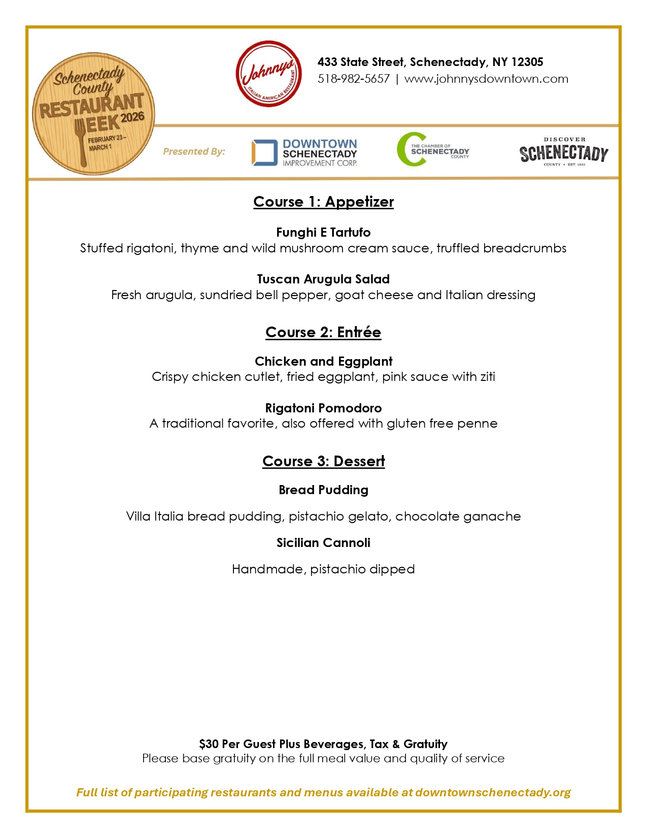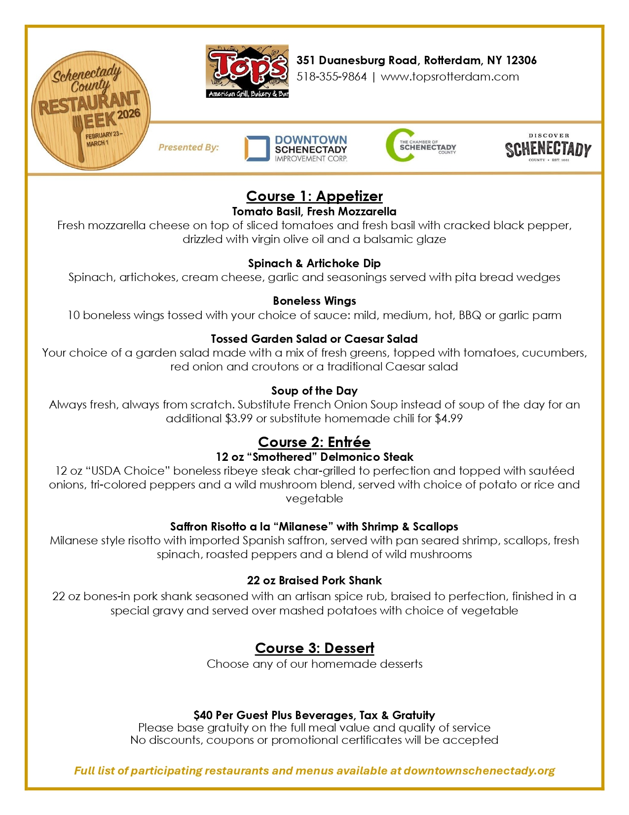 Kicking off today and running through Sunday, Schenectady County Restaurant Week involves 40 restaurants from Glenville to the Electric City serving up $20 two-course lunches and $30 or $40 three-course dinners. Here’s what’s on the menu.