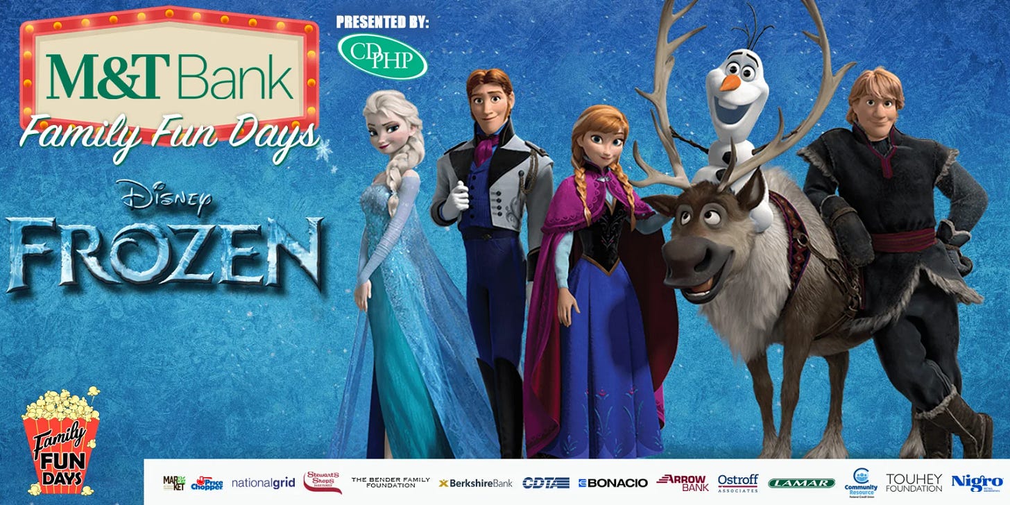 Frozen at The Palace: The Capital Region’s cold-weather spell may have finally broken, but at The Palace Theatre this Tuesday, everything is still Frozen—the movie, that is. At noon, the Albany theater will open for a free Family Fun Day complete with games, activities, and a screening of the Disney classic at 1pm.